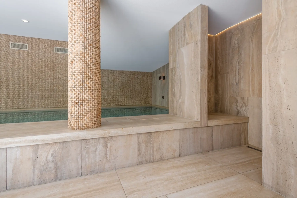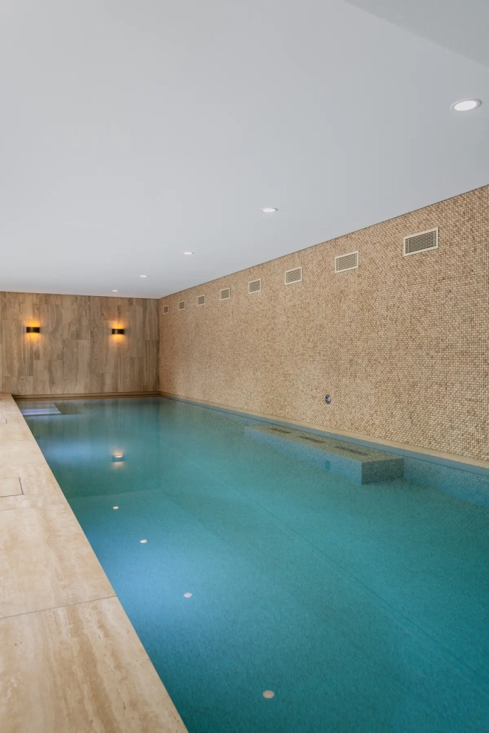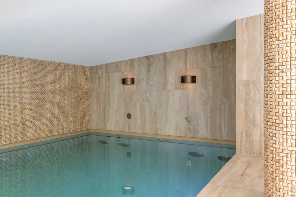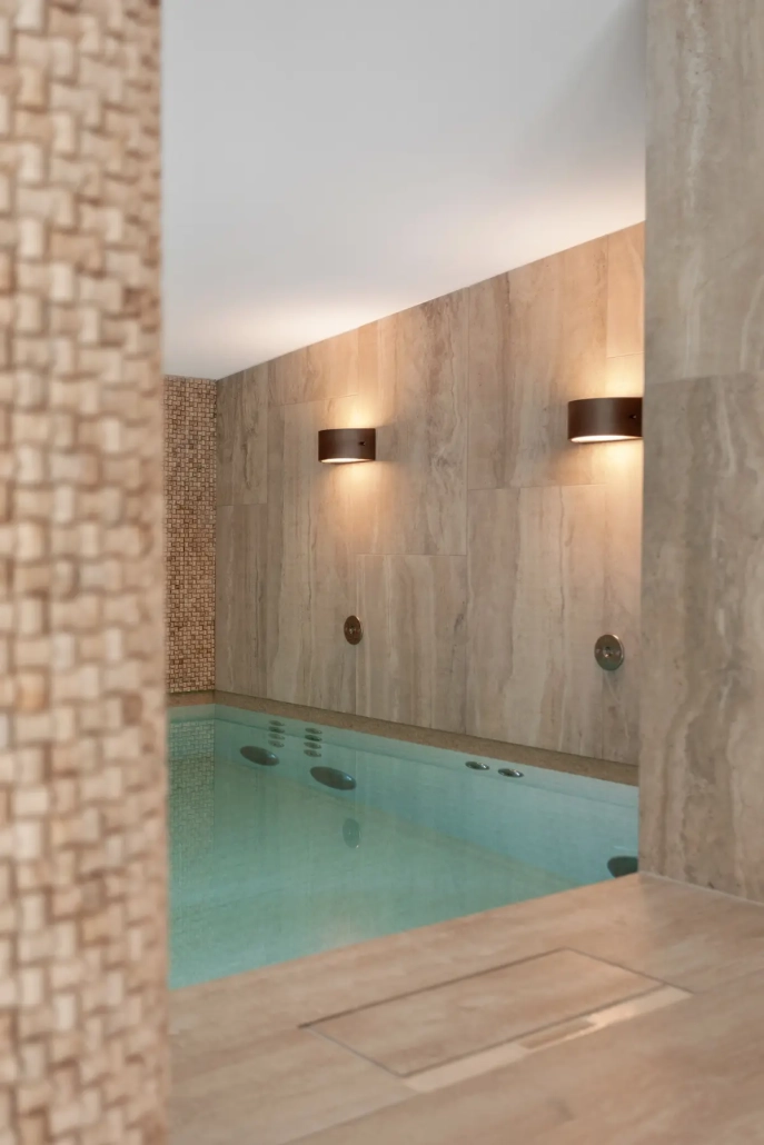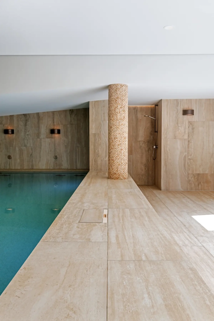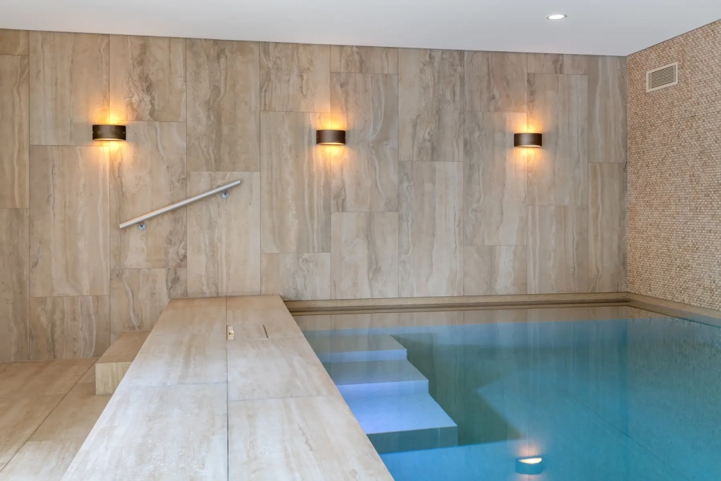 Het bekleden van de kleedruimte en zwembad met natuursteen en keramiek.
