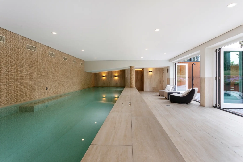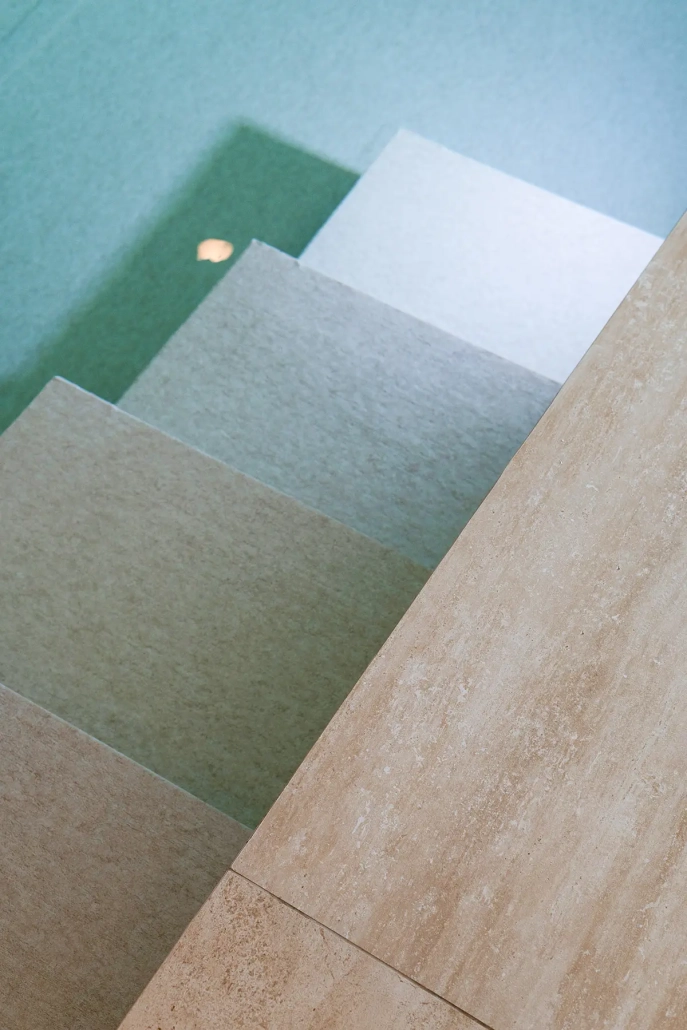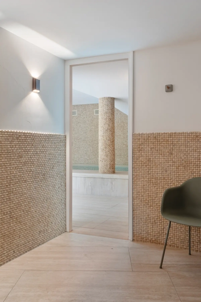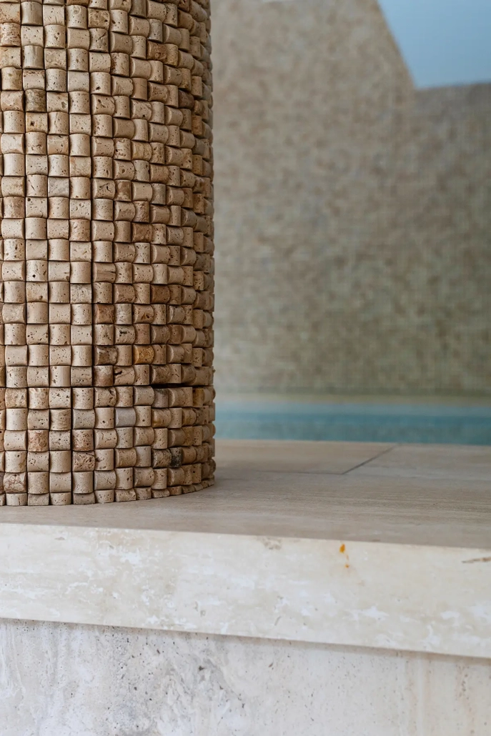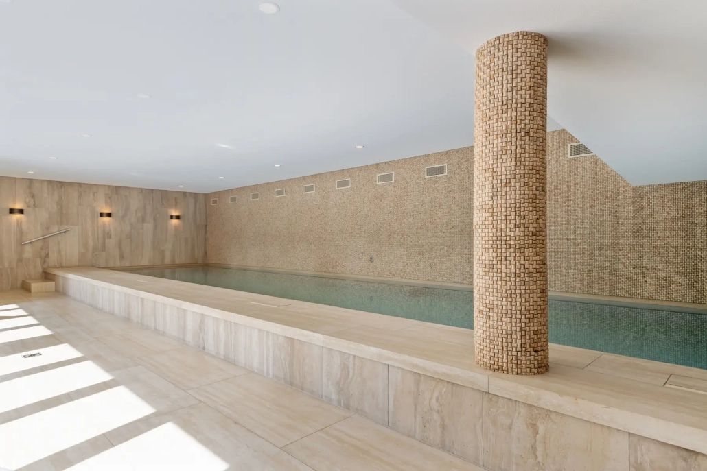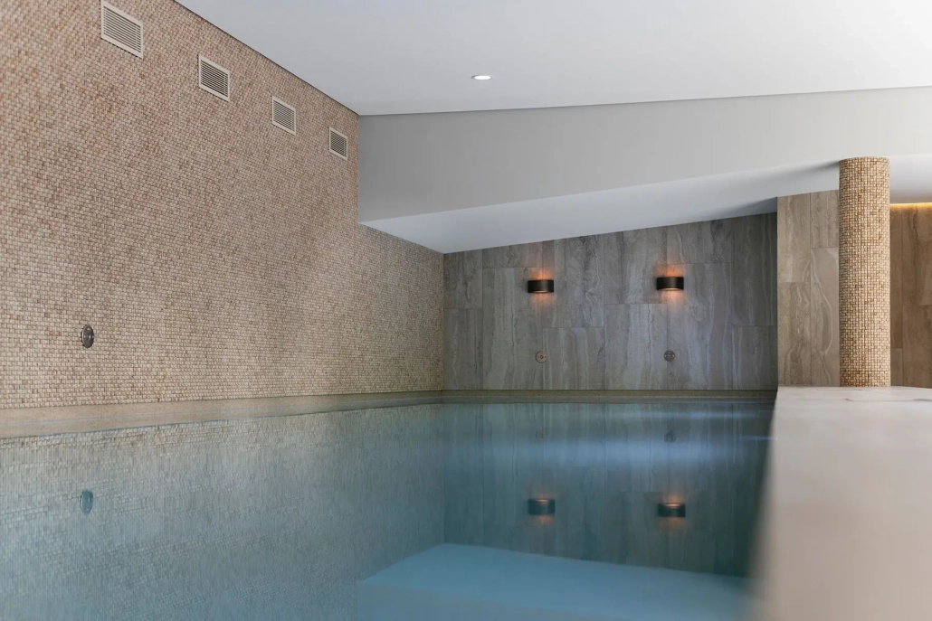 Het bekleden van de kleedruimte en zwembad met natuursteen en keramiek.