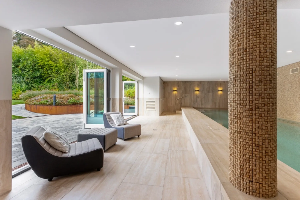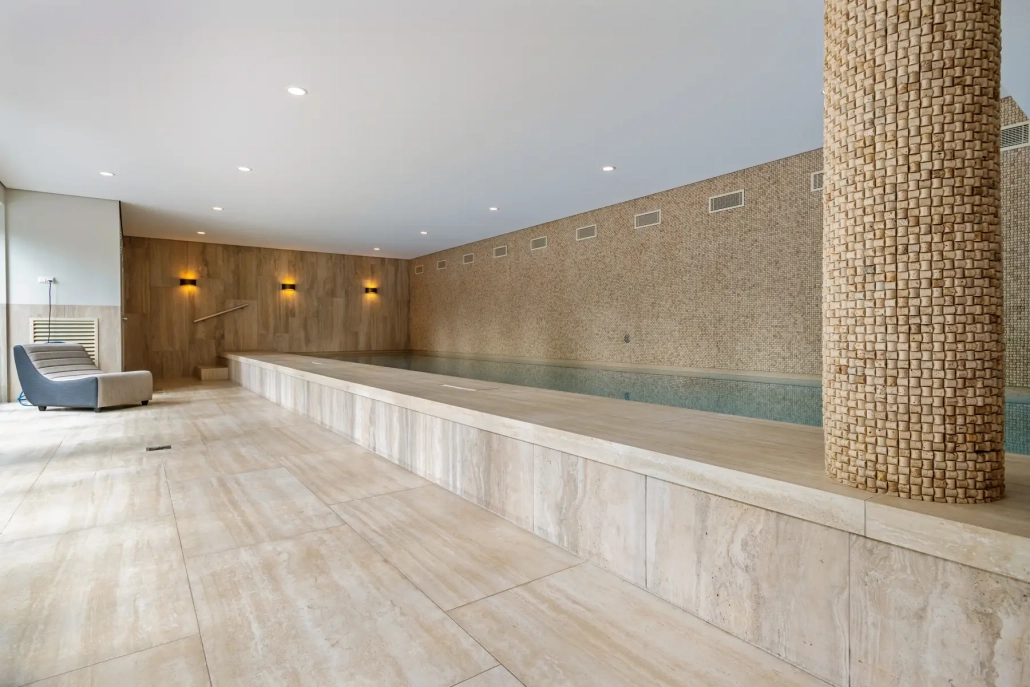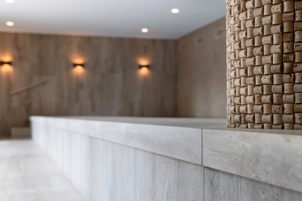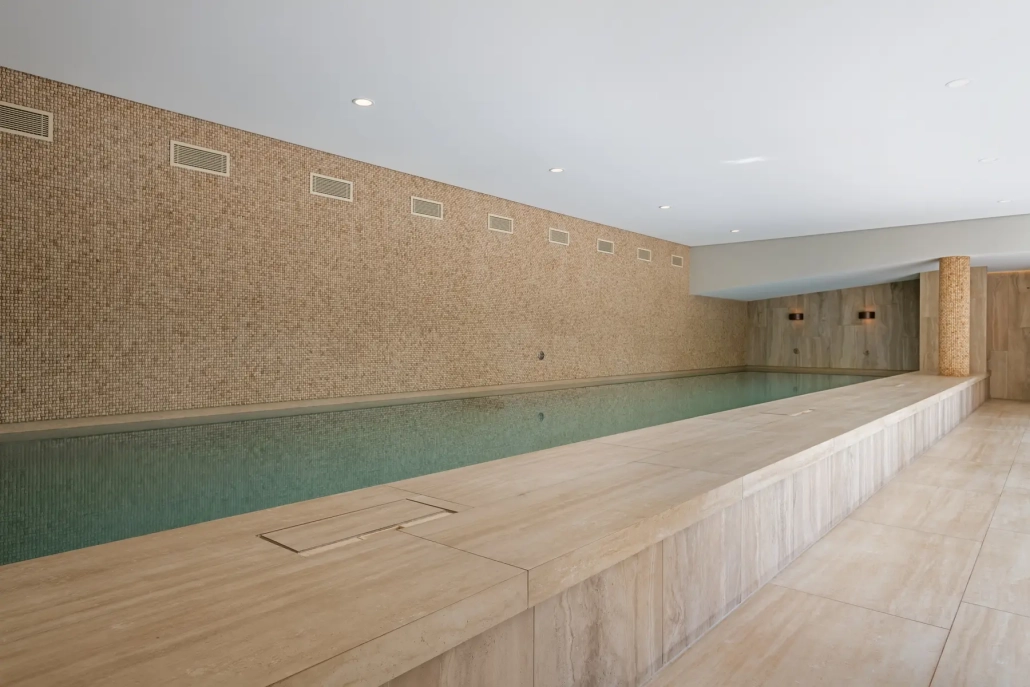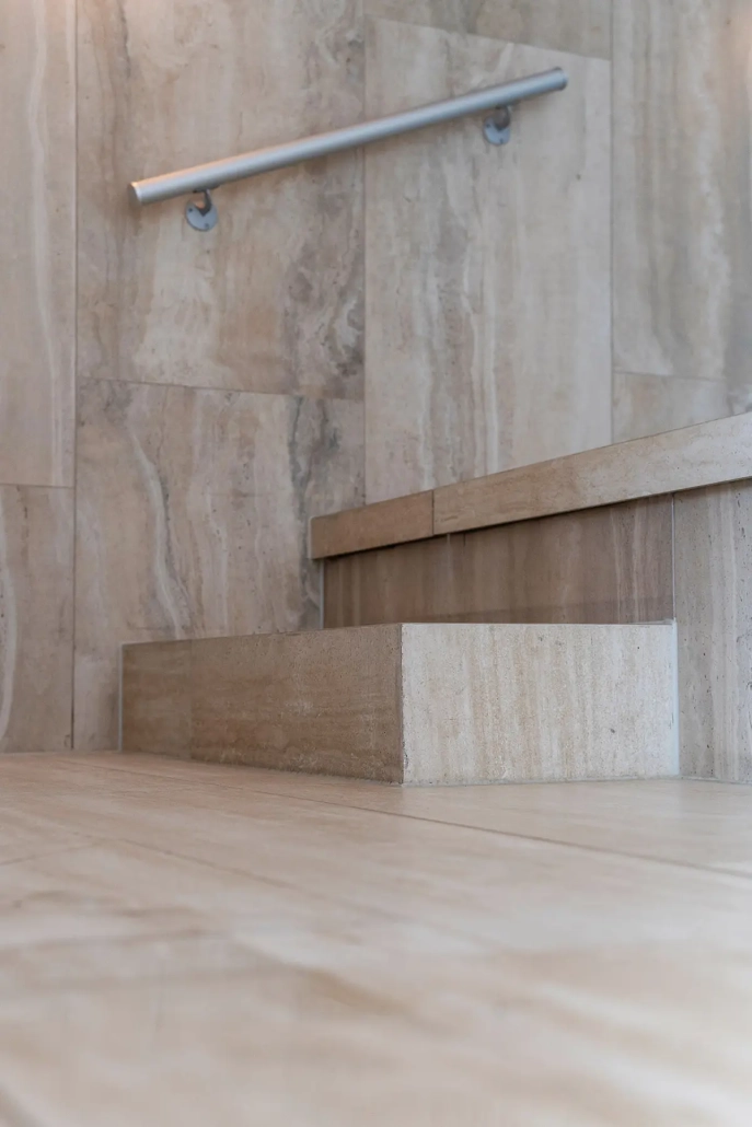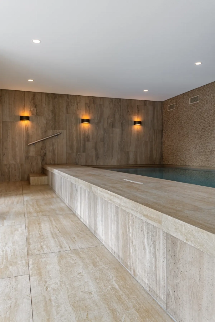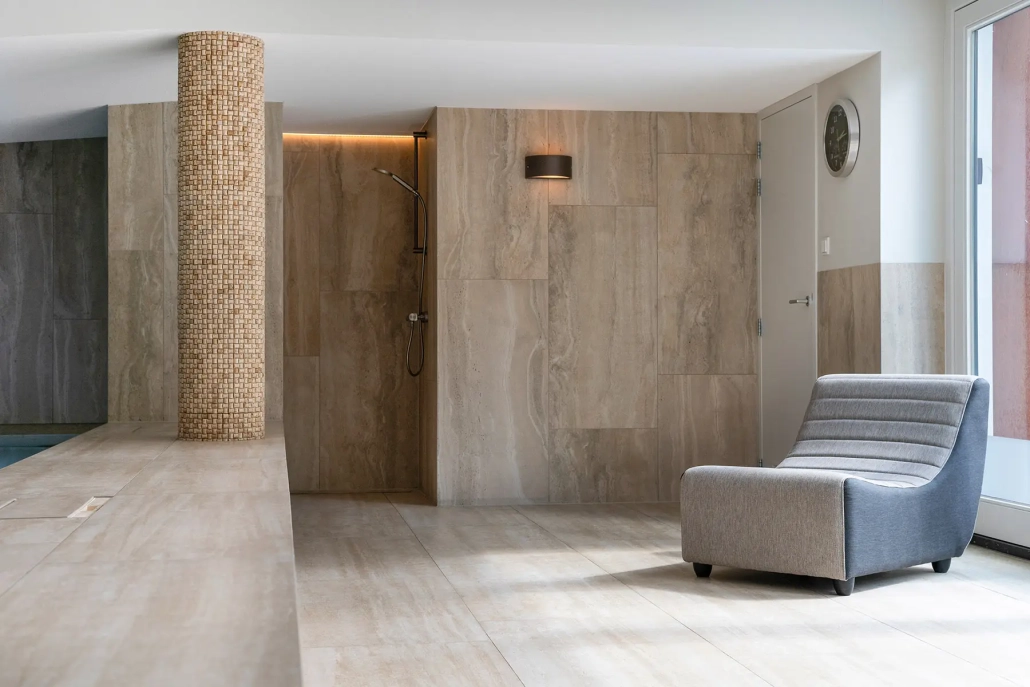 Voor The High Line BV Geertruidenberg verzorgden we de bekleding van de kleedruimte en het zwembad, uitgevoerd in een combinatie van natuursteen en keramiek.